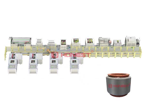 X-pin相比Hair-pin,端部高度降低,能进一步减少电机体积,有利于整车轴向空间的布局,功率密度提升,制造工艺相对波绕组简单,产线投入基于当前Hair-pin产线升级投资额较低,产品性能及投资明显超越波绕组,即将成为发卡电机新的趋势。X-pin扁线电机生产线适用于新能源汽车扁线电机定子的全自动生产线,配备柔性制线机,最高可适用于6线12层定子,可适应各种线型的生产,摆脱了一种线型就要一套模具的束缚,而且当其中一台设备故障时,其余设备仍可正常生产。